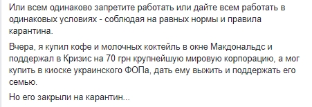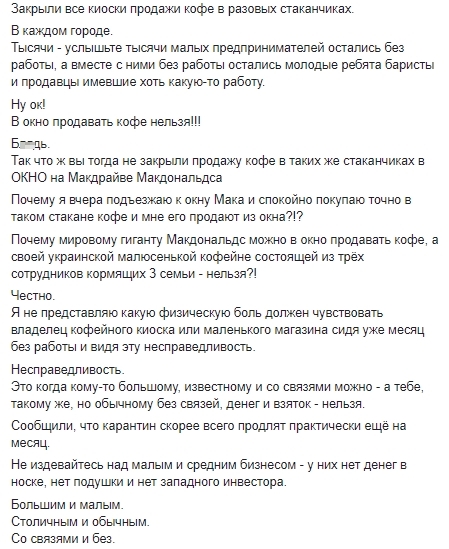 "Почему мировому гиганту Макдональдс можно в окно продавать кофе, а своей украинской малюсенькой кофейне состоящей из трех сотрудников кормящих 3 семьи - нельзя?!", - пишет бизнесмен.