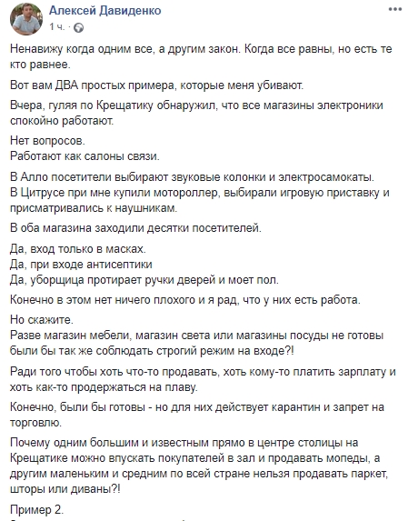 "Почему одним большим и известным прямо в центре столицы на Крещатике можно впускать покупателей в зал и продавать мопеды, а другим маленьким и средним по всей стране нельзя продавать паркет, шторы или диваны", - задает риторический вопрос Давиденко.