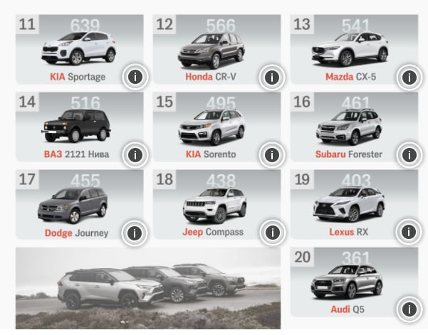 Что касается лидеров продаж, то по-прежнему в его главе остается Nissan Rogue (вместе с европейским аналогом X-Trail). Следом за ним идут Hyundai Tucson и Mitsubishi Outlander.