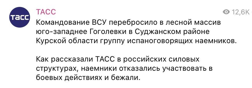 Матвеев также смеется над тем, как российское агентство ТАСС "проливает "лучик правды" на происходящее". Добавляет скриншот сообщения, в котором заявляется, что командование ВСУ якобы перебросило в лесной массив к юго-западу от Гоголевки в Суджанском районе Курской области группу испаноязычных наемников.