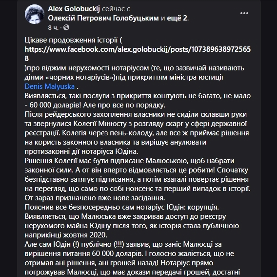 "Объяснение этому банально простое - коррупция. Оказывается, что Малюська уже закрывал доступ к реестру недвижимого имущества Юдину после того, как история стала публичной в конце октября 2020 года. Но сам Юдин публично заявил, что занес Малюське за решение вопроса 60 тысяч долларов и не получил ни решения, ни денег назад. Нотариус прямо угрожал Малюське, что имеет доказательства передачи денег, достаточные для уголовного преследования министра", – написал Голобуцкий.