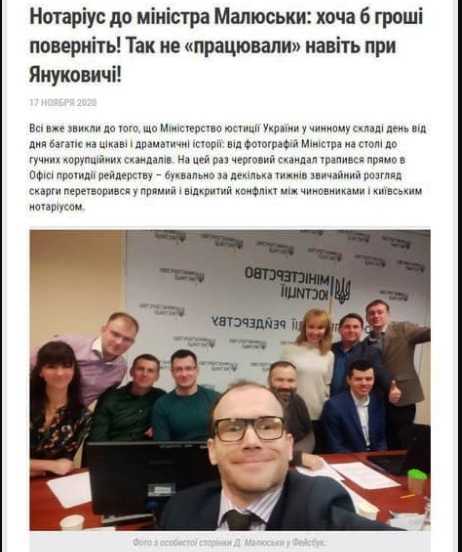 Частный нотариус Максим Юдин, который "ранее фигурировал в рейдерском захвате 35 объектов столичной недвижимости, якобы заплатил министру юстиции Денису Малюське 60 тысяч долларов за защиту его интересов".