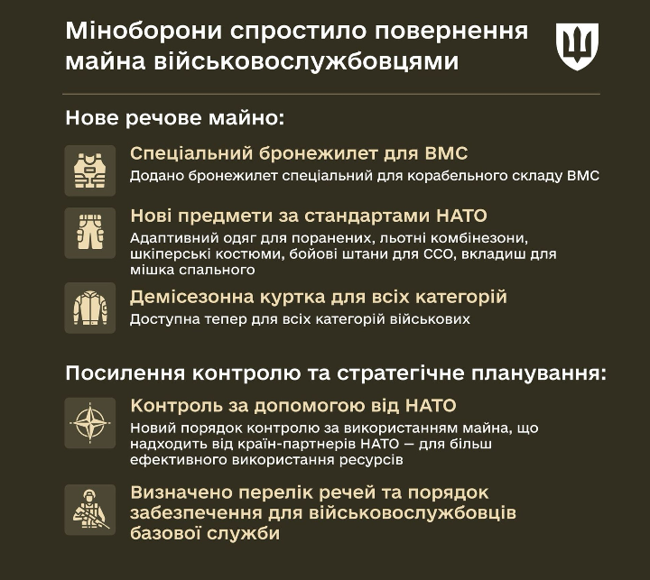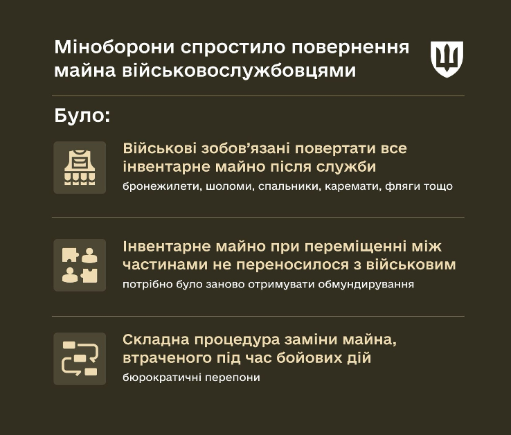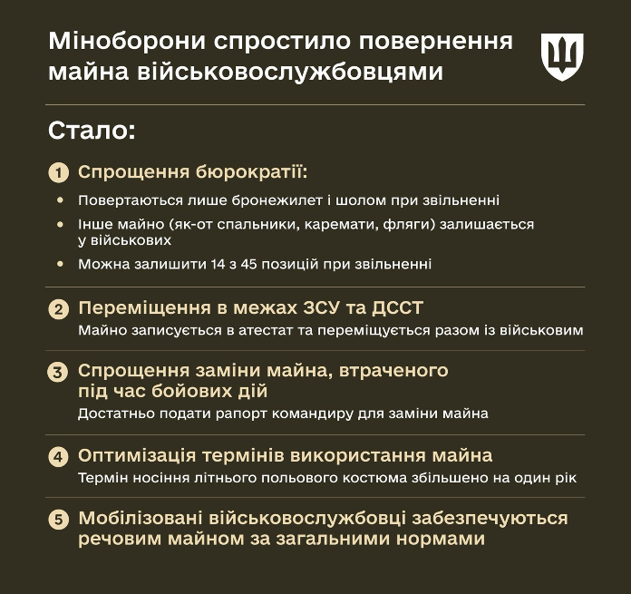 По словам замминистра обороны Дмитрия Клименкова, упрощение бюрократических процедур возврата имущества призвано облегчить службу для бойцов ВСУ.