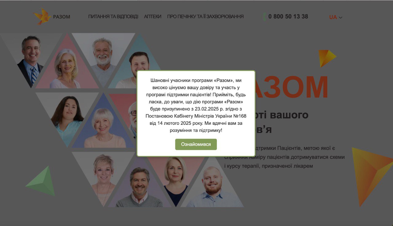 "Примите, пожалуйста, к сведению, что действие программы "Разом" будет приостановлено с 23.02.2025 года согласно постановлению Кабинета Министров Украины №168 от 14 февраля 2025 года", - говорится в сообщении на сайте программы.