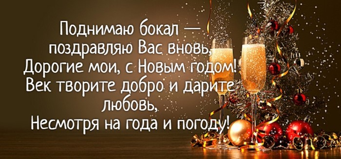 Провожая уходящий год, мы от души благодарим его за возможность встретиться всей семьей за этим праздничным столом и поднять бокал под бой курантов. Пусть год грядущий будет столь же добрым к нашей семье и подарит каждому присутствующему за столом много радостных моментов, тепло любви родных и близких, а также успех в любых начинаниях.