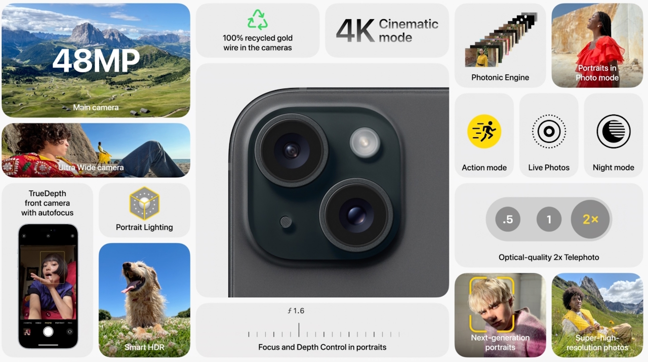 Основная камера получит 48 Мп, остальные – 12 Мп. В базовую версию iPhone 15 также вернули двойной зум, улучшили портретный и ночной режимы.