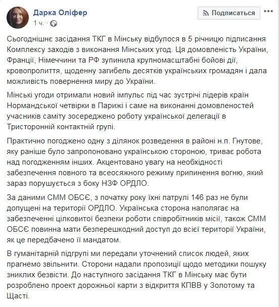 Об этом сообщила пресс-секретарь представителя Украины в ТКГ Леонида Кучмы Дарка Олифер на своей Facebook-странице.