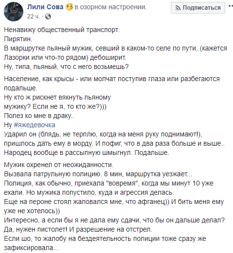 "В маршрутке пьяный мужик, севший в каком-то селе по пути, (кажется Лазорки или что-то рядом) дебоширит. Ну, типа, пьяный, что с него возьмешь? Население, как крысы - или молчат поступив глаза или разбегаются подальше. Ну кто ж рискнет вякнуть пьяному мужику? Если не я, то кто же?))) Полез ко мне в драку.. Ну я же девочка. Ударил он (бл*дь, не терплю, когда на меня руку поднимают!), пришлось дать ему в морду. И пофиг, что в два раза больше и выше..Народец вообще в рассыпную шмыгнул. Подальше", - написала волонтер.