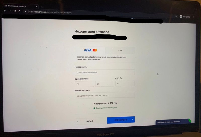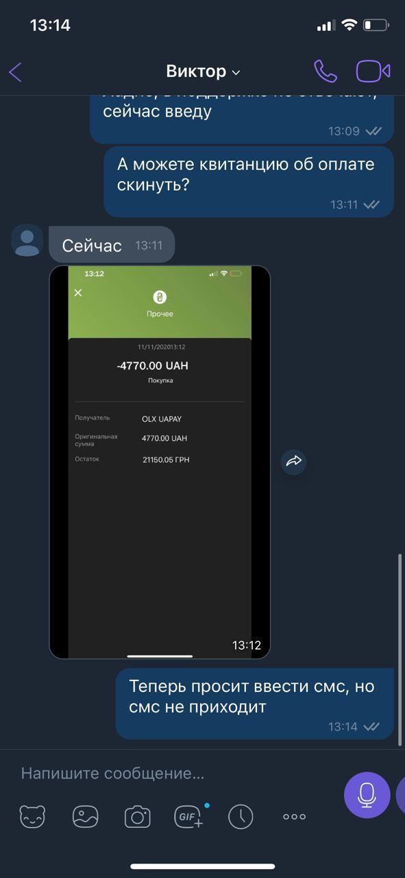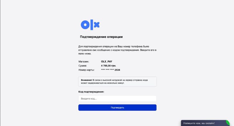 Обманутые переходят по ссылке и вводят номер карты, также пишут актуальный баланс на карте. В это время якобы сайт OLX имитирует высокую загруженность и просит ввести код из смс, для подтверждения оплаты. Так продавцы сами открывают доступ к своей карте для злоумышленников.