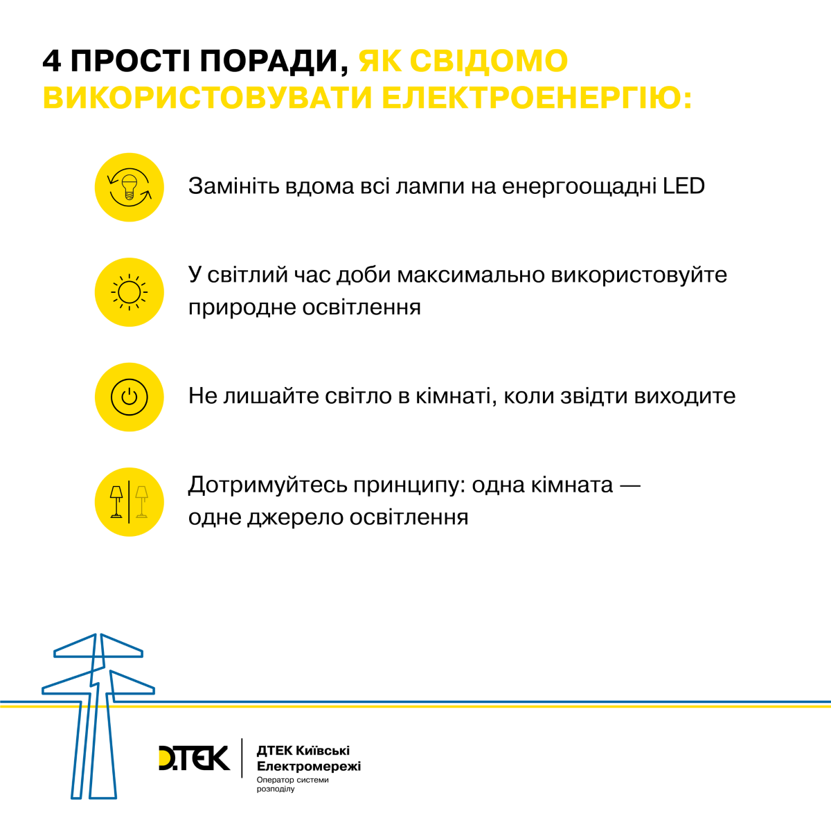 В "ДТЭК Киевские электросети" напомнили правило "одна комната – один источник освещения". Лампы накаливания нужно заменить на энергосберегающие LED. В светлое время суток надо по максимуму использовать природное освещение.