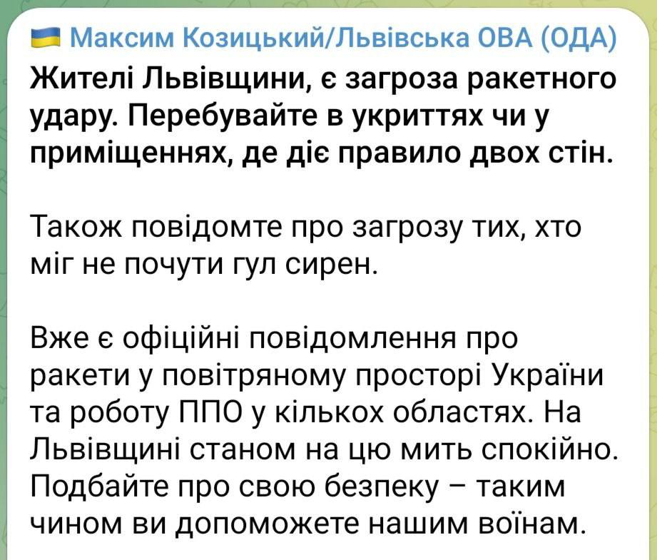 По состоянию на 09:31 утра ПВО сработало над многими областями. Однако есть угроза ракетного удара по Львовщине.
