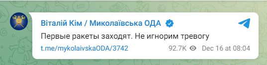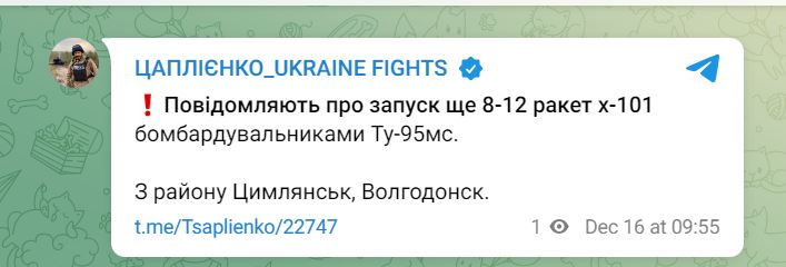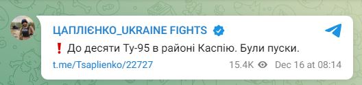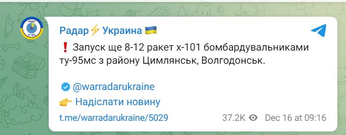 В пятницу, 16 декабря, около 8 утра российские стратегические бомбардировщики осуществили пуски крылатых ракет в сторону Украины с территории Каспийского моря.