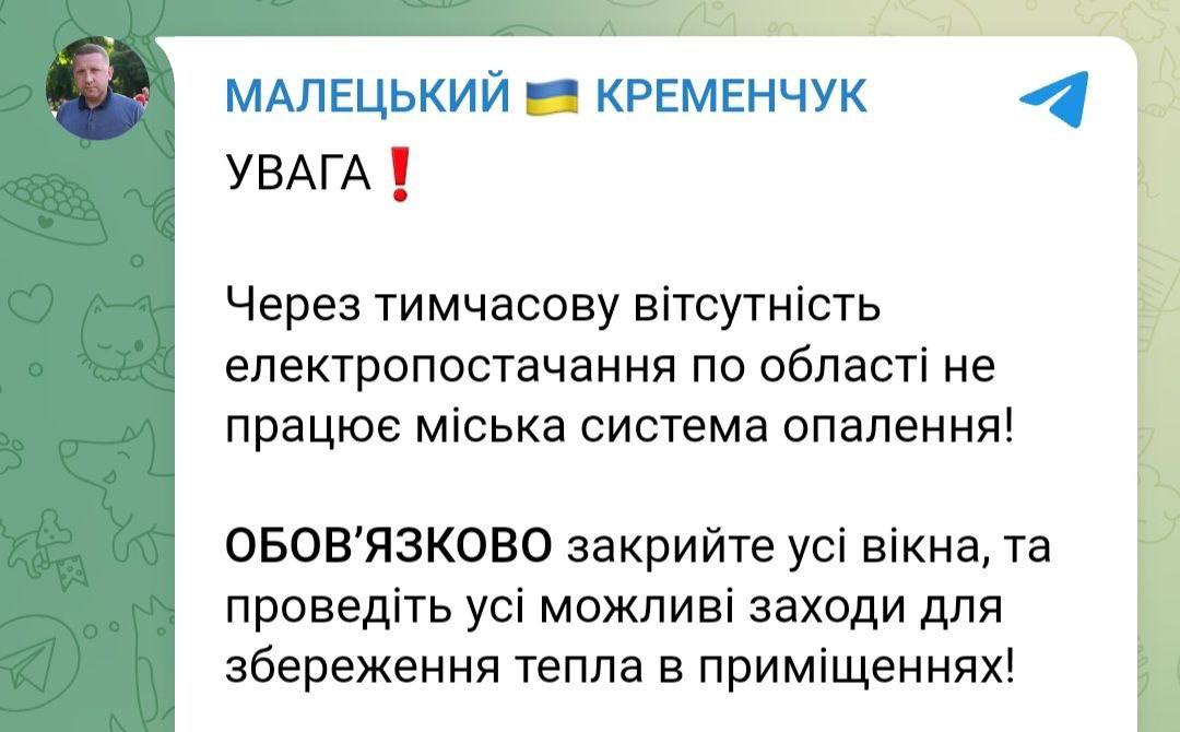 А в Кременчуке из-за отсутствия энергоснабжения отключена система отопления жилых домов.