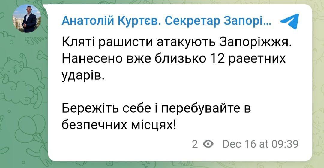 Также сообщается о ряде ракетных "прилетов" по Запорожью.