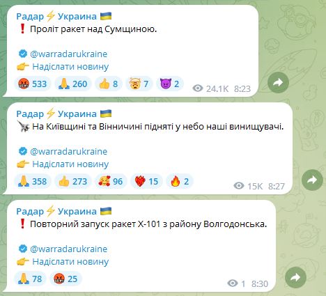 Как сообщает телеграмм-канал "Радар", произошли повторные пуски ракет, они зашли в воздушное пространство Украины по нескольким направлениям.