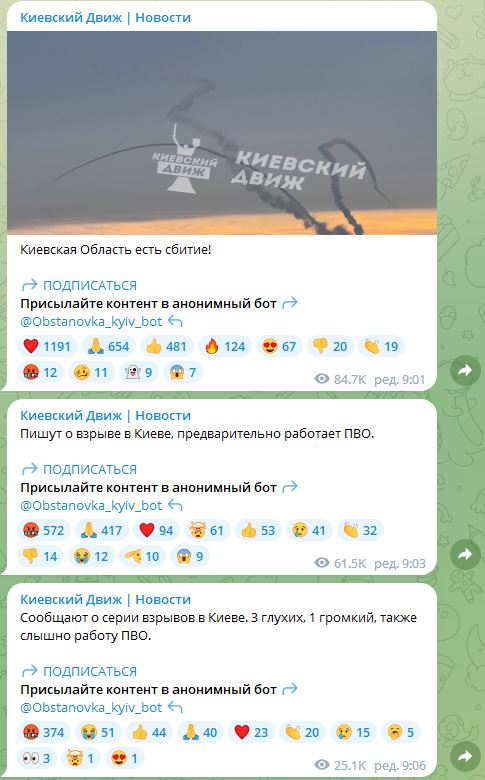 Сообщается о нескольких взрывах в Киеве и удачную работу ПВО.