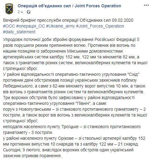 К тому же, 9 февраля, в результате вражеских обстрелов один украинский защитник получил ранения.