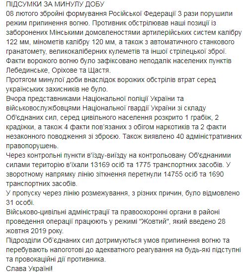 Как сообщалось, с начала суток воскресенья, 2 февраля, на Донбассе, где боевики устроили новые провокации, обстреляв позиции ВСУ вблизи Крымского и Луганского, трое украинских военнослужащих получили ранения.
