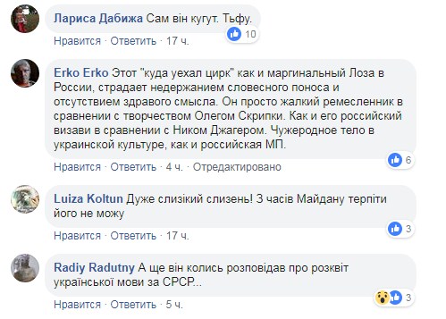 "То есть, это стареющее Безмозглое чмо продолжает на 28-м году независимости, в конце 5-го года войны с оккупантом втюхивать совковую установку "все украинское - это тупое село, а "гарадская настаящая культура - эта русские", - добавил политолог.