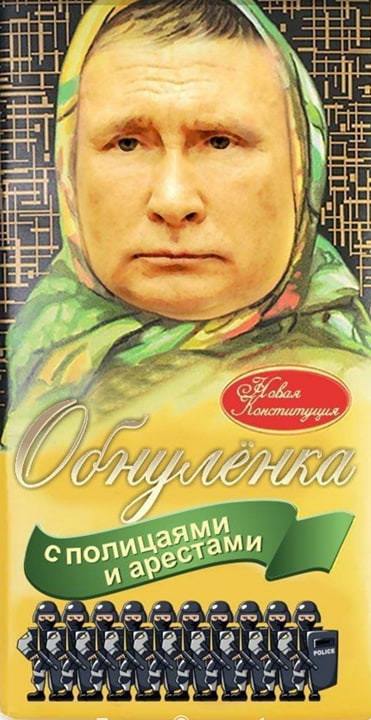 На фотожабе изобразили обертку известной шоколадки "Аленка", но в интерпретации автора ее название изменилось на "Обнуленка", а лицо милой девушки в платочке заменили Путиным.