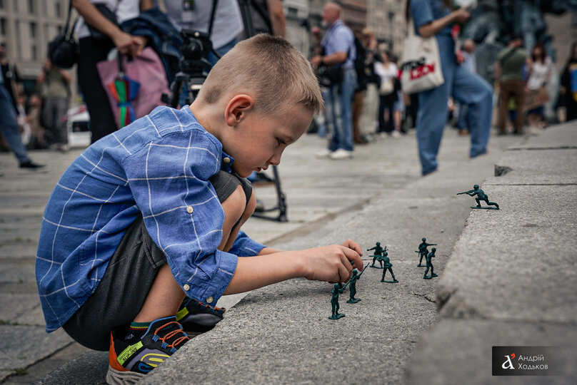 Маленький Тарас играет солдатиками во время акции в память о погибших украинских пленных в Еленовском СИЗО. В его руках - не просто игрушки, а символы несокрушимости поколения, растущего в войне.
