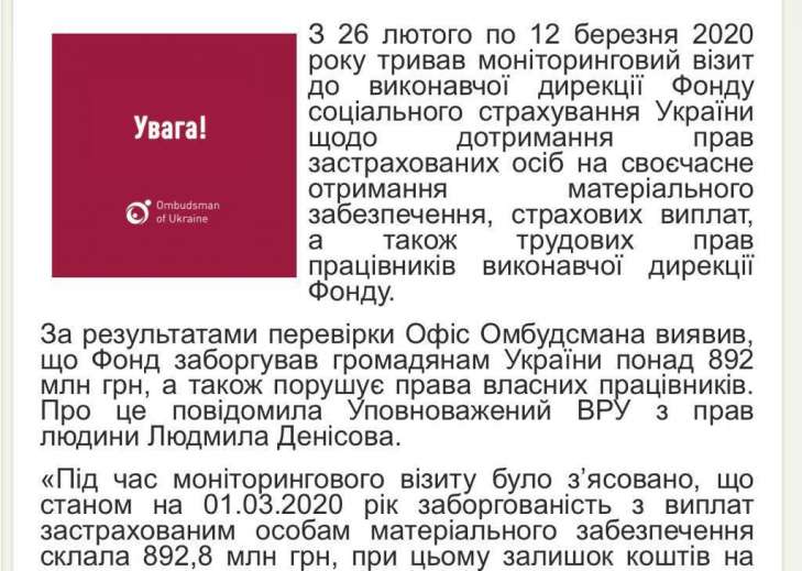В частности, 26 марта сайт Уполномоченного ВРУ по правам человека сообщил, что по результатам мониторингового визита в исполнительную дирекцию Фонда по соблюдению прав застрахованных лиц на своевременное получение материального обеспечения, страховых выплат, а также трудовых прав работников исполнительной дирекции Фонда, было выявлено, что 26 февраля по 12 марта Фонд задолжал гражданам Украины более 892 млн грн.