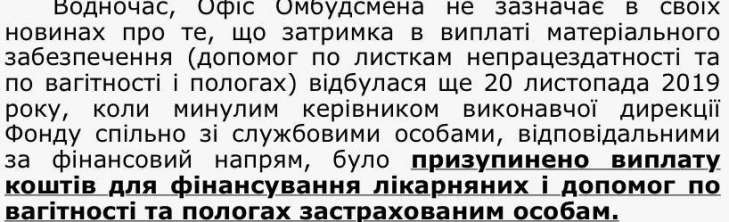 Сайт исполнительной дирекции Фонда социального страхования Украины отмечает, что Офис омбудсмена не акцентирует внимание на том, что задержка в выплате материального обеспечения состоялась еще 20 ноября 2019, когда прошлым руководителем исполнительной дирекции Фонда совместно с должностными лицами, ответственными за финансовое направление, была приостановлена выплата средств для финансирования больничных и пособий по беременности и родам застрахованным лицам.
