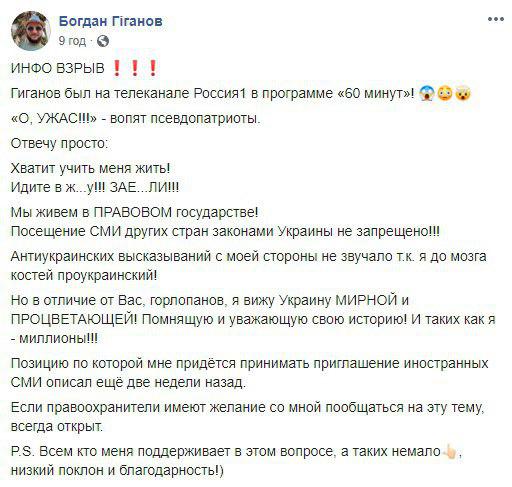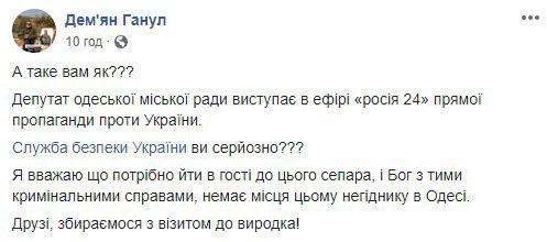 Депутат Городского совета Одессы Богдан Гиганов появился в эфире пропагандистского российского телеканала "Россия 1".