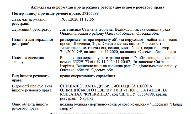 Согласно реестру прав на недвижимое имущество, 19 ноября регистрацию оформила регистратор Великодолинского поссовета Овидиопольского района Одесской области.