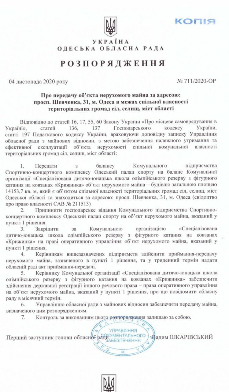 Накануне первой сессии Одесского облсовета Дворец спорта, вопреки судебному запрету, передали спортивной школе "Льдинка", которая заключила договор с инвестором и частник получил контроль над ареной.
