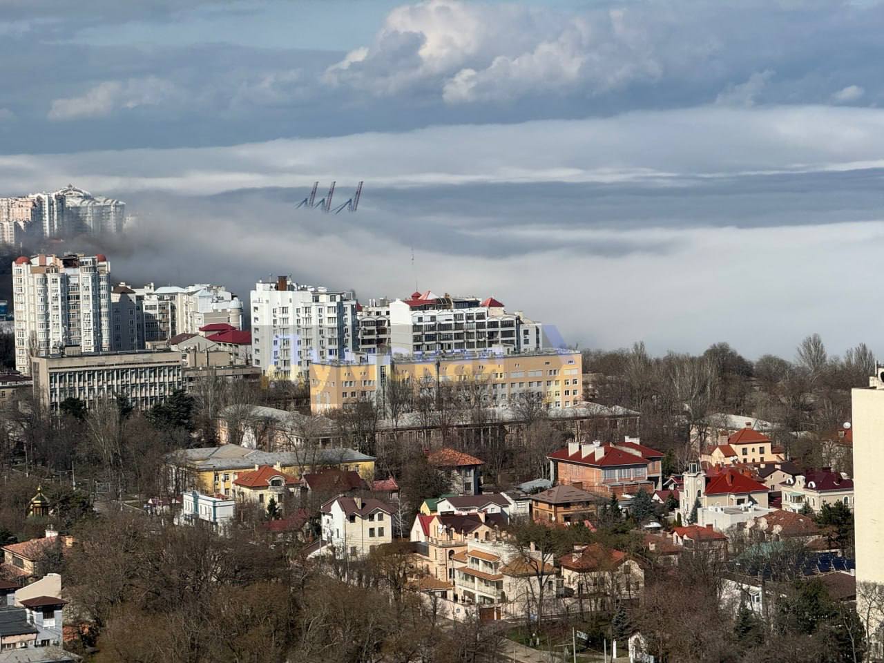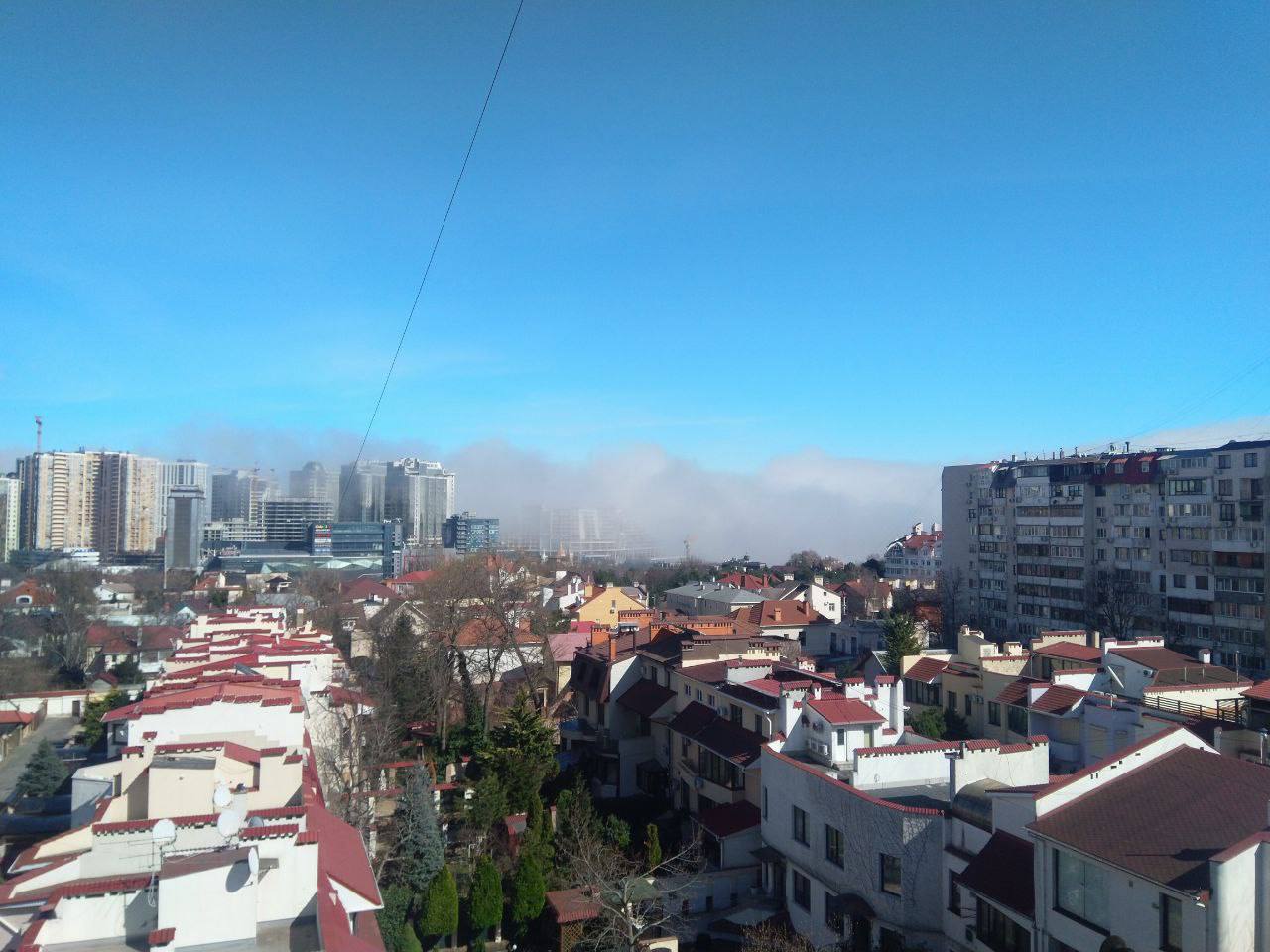 На кадрах, сделанных жителями города на берегу Черного моря из окон многоэтажных домов и во время прогулки по Одессе, можно увидеть, что этот необычный туман медленно идет в город полосками.