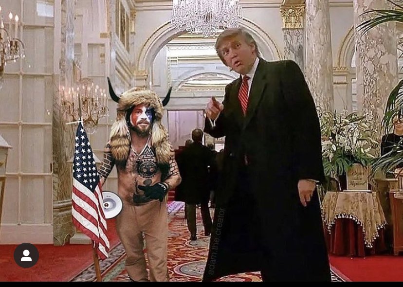Впрочем, один из авторов фотожабы решил оставить в кадре Дональда Трампа, убрав вместо этого главного героя фильма, заменив его "героем" недавнего штурма Капитолия.