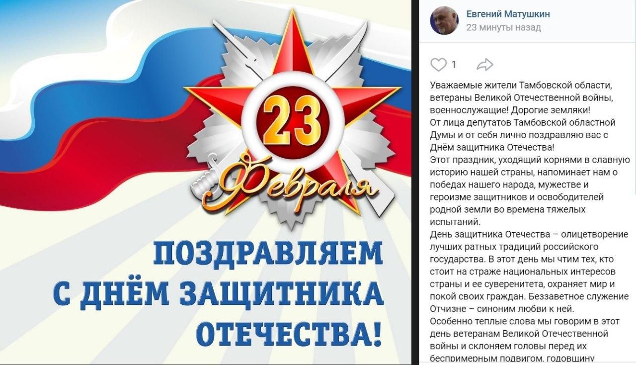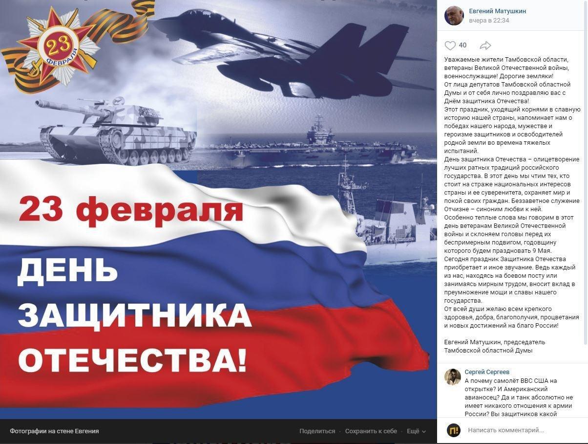 Глава Тамбовской облдумы Евгений Матушкин оконфузился с поздравлением граждан с днем советской армии, который празднуют 23 февраля, он прикрепил открытку с техникой НАТО.