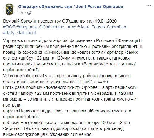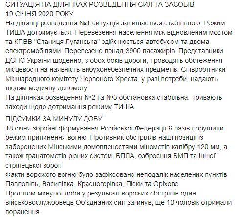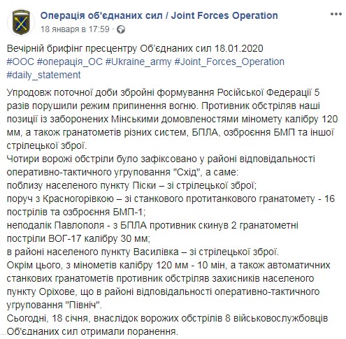 Отметим, что уже в воскресенье, 19 января в пресс-центре ООС уточнили, что в результате обстрелов боевиков в субботу один украинский военнослужащий погиб и десять получили ранения.