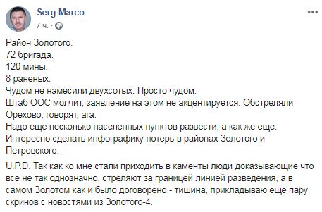 "Район Золотого. 72 бригада. 120 мины. 8 раненых. Чудом не намесили двухсотых. Просто чудом. Штаб ООС молчит, заявление на этом не акцентируется. Обстреляли Орехово, говорят, ага Надо еще несколько населенных пунктов развести, а как же еще. Интересно сделать инфографику потерь в районах Золотого и Петровского", - написал он.