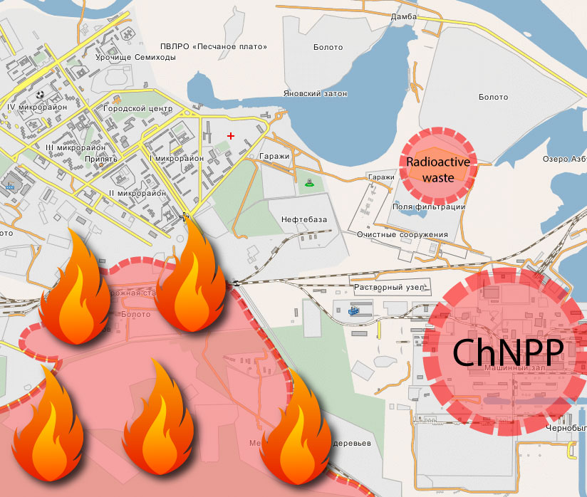 По его словам, сейчас огонь добрался города Припять и находится в двух километрах прямо от хранилищ радиоактивных отходов "Подлесный", где расположены наиболее высокоактивные радиационные отходы всей Чернобыльской зоны, и от самой ЧАЭС.