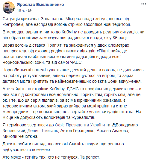"Ситуация критическая. Зона пылает. Местная власть отчитывается, что все под контролем, но на самом деле огонь стремительно захватывает новые территории. У меня два варианта: или в Кабмин не доводят реальную ситуацию, или он выбрал политику замалчивания советской власти, как в 86 году", - написал Емельяненко.