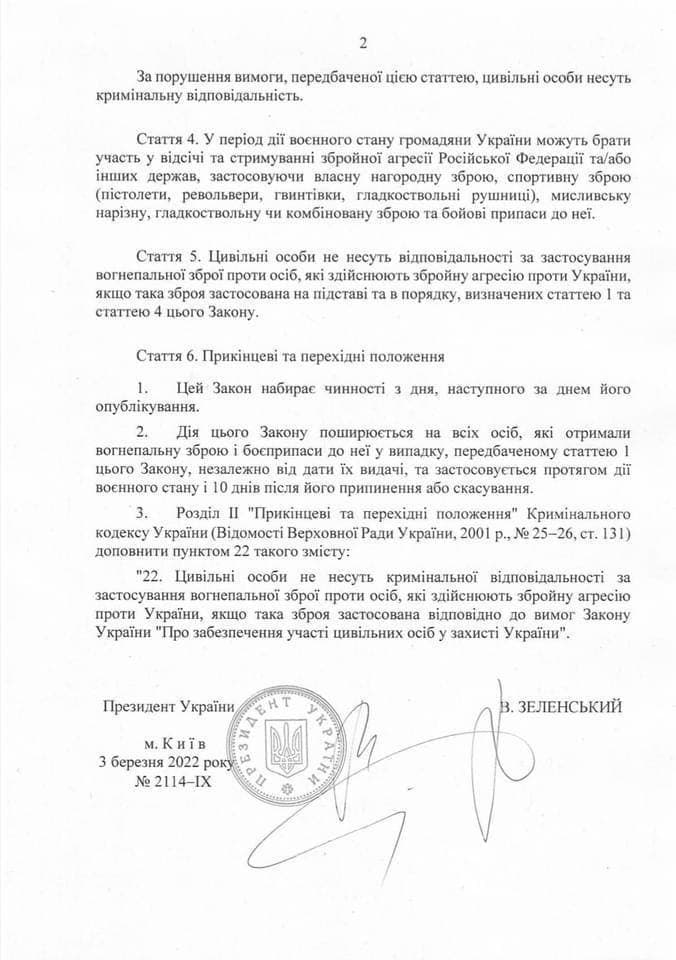 Глава государства подписал закон "Об обеспечении участия гражданских лиц в защите Украины". Данный нормативно-правовой акт предусматривает порядок выдачи и возвращения огнестрельного оружия гражданскому населению для защиты страны в военное время - в нем также говорится о том, что гражданские лица не несут ответственности за применение оружия против оккупантов и тех лиц, которые осуществляют вооруженную агрессию против Украины.