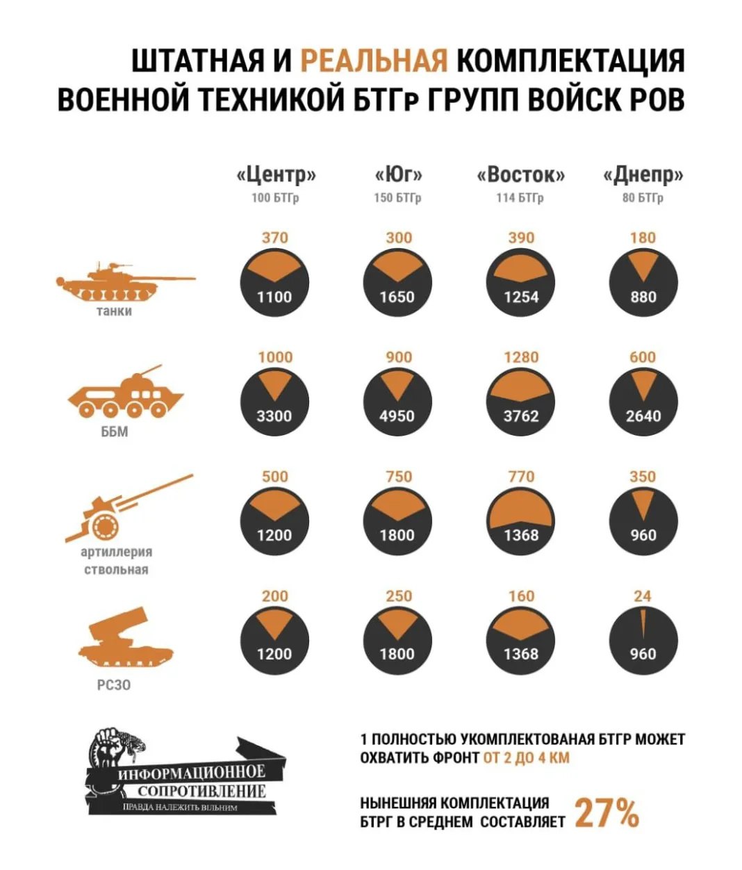 Так, комплектация батальонно-тактических групп в среднем составляет менее 30%. В то время как одна полностью укомплектованная БТГр может охватить фронт от двух до четырех километров.