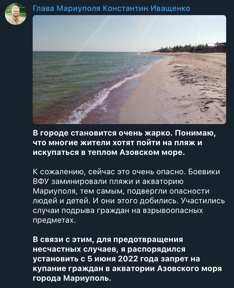 "Внезапно оккупанты запретили доступ на пляжи и купание в море. Совпадение с выводом, что вода в море чистая и даже чище, чем до войны?", – пишет Андрющенко.