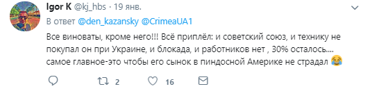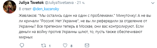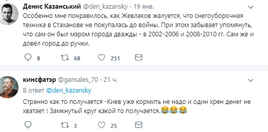 "Особенно мне понравилось, как Жевлаков жалуется, что снегоуборочная техника в Стаханове не покупалась до войны. При этом забывает упомянуть, что сам он был мэром города дважды - в 2002-2006 и 2008-2010 гг. Сам же и довел город до ручки", "Странно как то получается -Киев уже кормить не надо и один хрен денег не хватает ! Замкнутый круг какой то получается", "Минуточку! А не вы ли кричали "Россия! Нет Украине", не вы ли рефередили за отделение от Украины? Все претензии теперь в Москве, они вас контролируют. Если деньги на войну против Украины шлют, то, пусть также обеспечивают мирных", - пишут комментаторы.