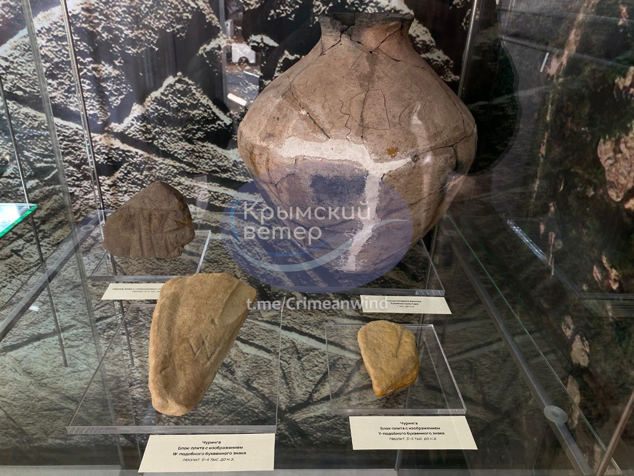 Оккупанты демонстрируют в Херсонесе артефакты, украденные из музея Каменная Могила под Мелитополем. Среди них - пиктографические символы неолита и бронзы, нанесенные на чуринги ‒ священные предметы, в которые, как считалось, переселялась душа.