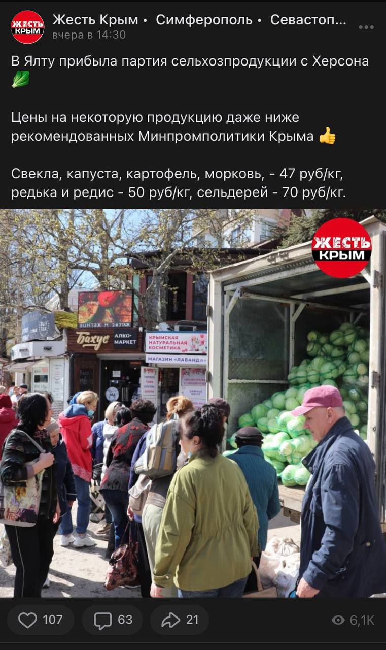 В то время, как кремлевские пропагандисты рассказывают о "налаживании жизни" во временно занятом Херсоне, российские оккупанты вывозят все продукты из местных магазинов в аннексированный Крым, продавая их по сниженным ценам.