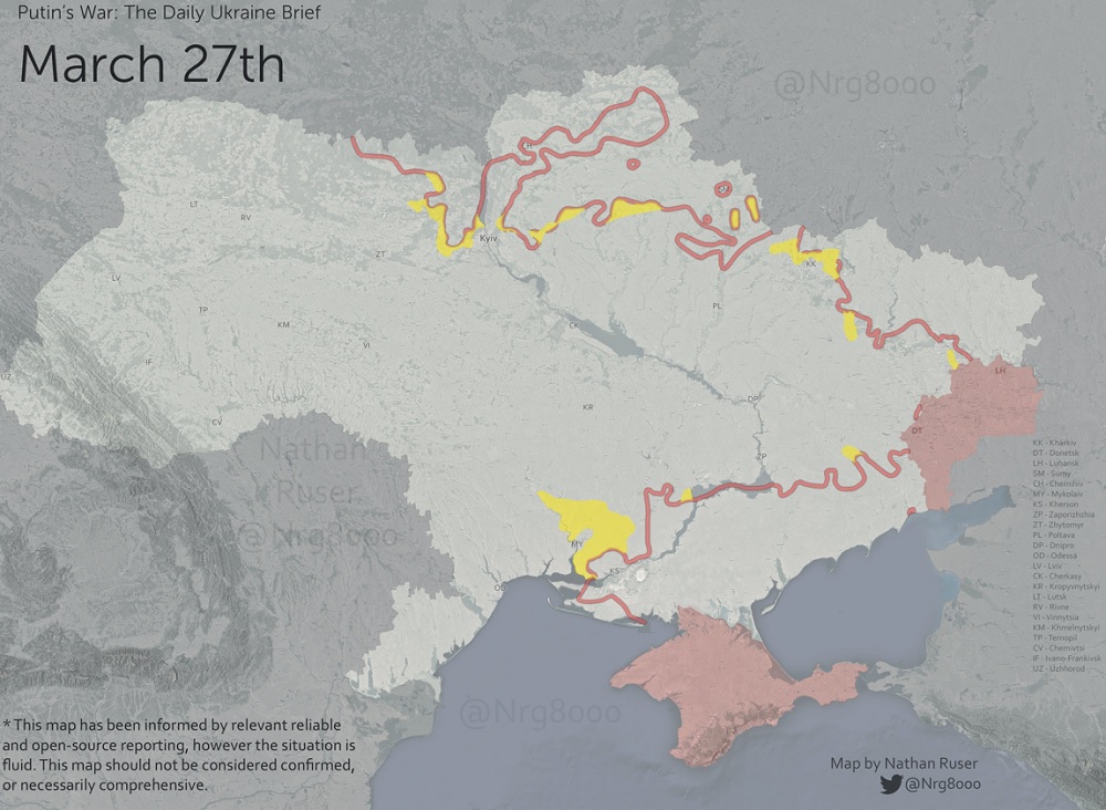 По состоянию на вечер воскресенья, 27 марта, на 32 сутки российские оккупанты похищают и запугивают местных жителей, удерживают граждан Украины в заложниках на временно занятых территориях. Также продолжается милитаризация армией РФ зоны отчуждения ЧАЭС.