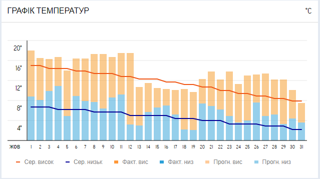 Октябрь 2024 года в Украине также обещает быть теплым – синоптики прогнозируют, что средняя температура воздуха за месяц может превысить климатическую норму на 2 градуса.