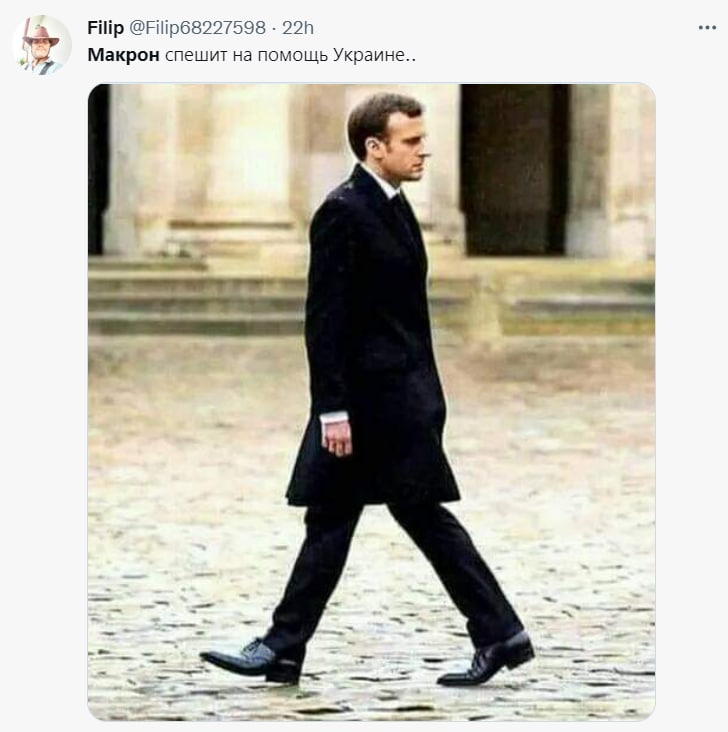 Также пошутили и над президентом Франции Эмманюэлем Макроном – ногами он идет навстречу Украине, говорит, что будет помогать, а вот голова его смотрит в другую сторону – в той стороне "вступление Украины в ЕС затянется на 15-20 лет" (это слова министра Франции в европейских делах Клемана Бона).