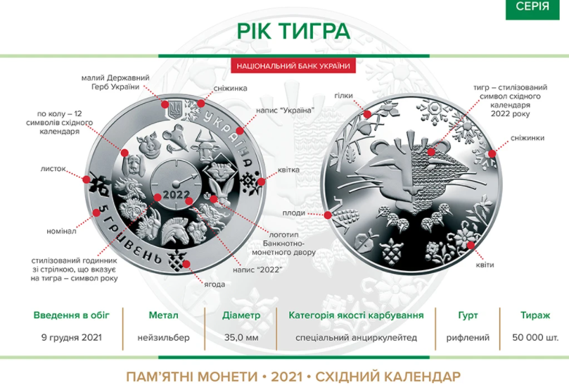 В начале декабря Национальный банк Украины 9 декабря ввел в обращение памятную монету "Год тигра" номиналом 5 грн.