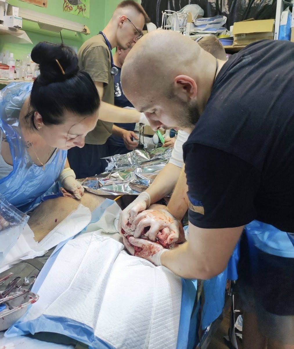 "Вокруг - руины дома, куча бетонных плит и узкий проход, где лежит заблокированный раненый военный. К нему по очереди пробираются: анестезиолог, который обеспечивает бойцу дыхание, ставит капельницу и вводит обезболивающие, а затем - с несколькими скальпелями и турникетами - под завалы лезет хирург Алексей Носулько. Хирург ампутировал ему ноги. Правую - без особых осложнений, а вот для того, чтобы прооперировать левую, врачу пришлось вручную разворачивать завалы, накладывать турникет и продолжать операцию кухонным ножом", - рассказали в Медсилах.