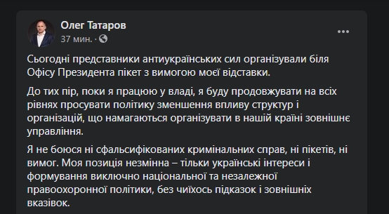 "Я не боюсь ни сфальсифицированных уголовных дел, ни пикетов, ни требований. Моя позиция неизменна - только украинские интересы и формирование исключительно национальной и независимой правоохранительной политики, без чьих-то подсказок и внешних указаний", - отметил Татаров.