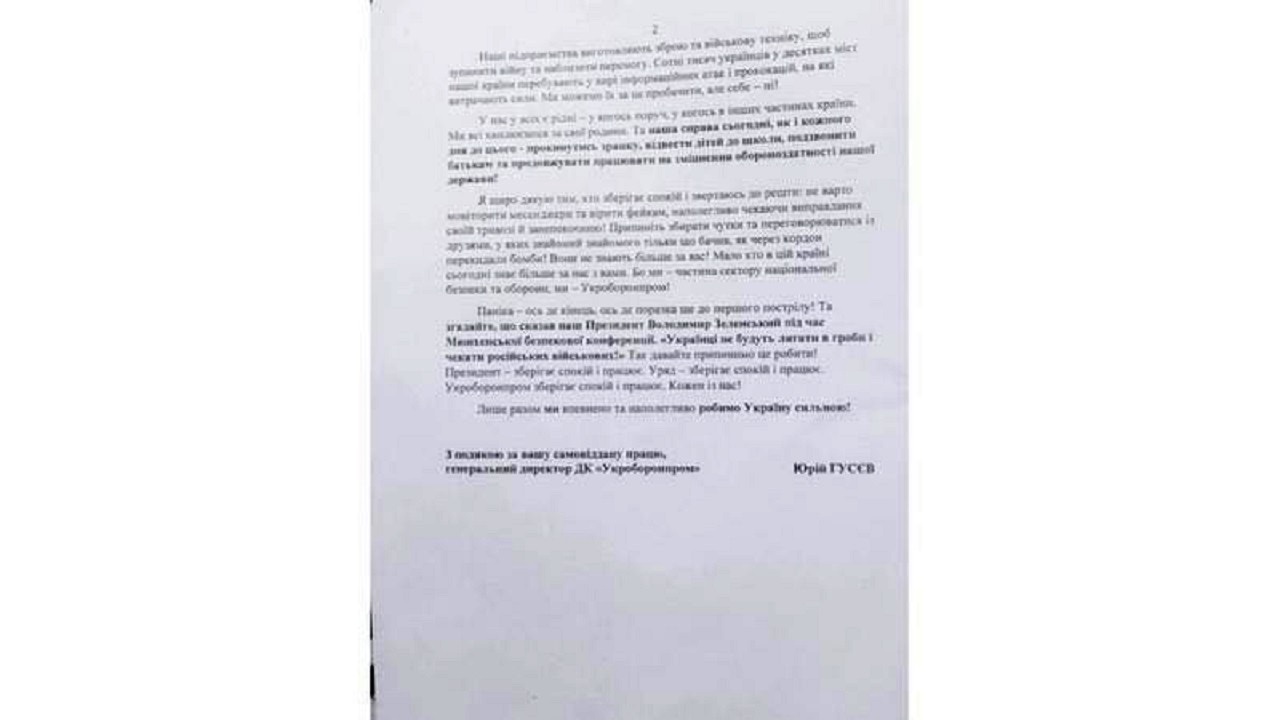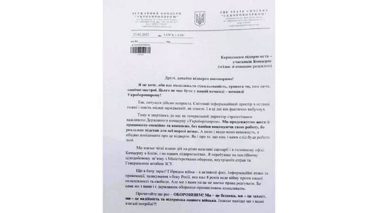 Предприятия "Укроборонпрома" 23 февраля 2022 года получили письмо от тогдашнего главы концерна Юрия Гусева с заверением о существовании плана действий, который так никто и не получил.